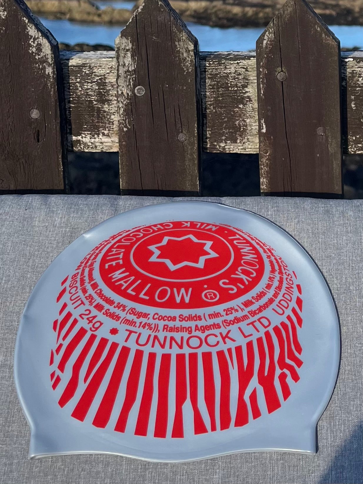 This swimming cap was originally seen back in 2016 when a group of freedivers decided to swim the length of the English Channel in a swimming pool in Bellshill, all in aid of St Abbs Lifeboat.  Featuring the iconic Tunnocks teacake logo these one size silicone swim caps are perfect for keeping your hair safe whilst swimming.